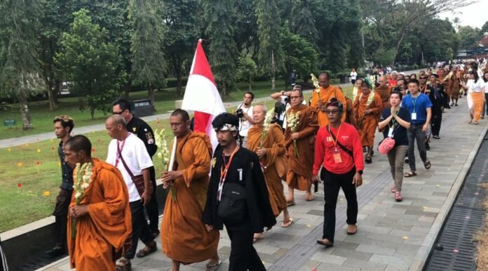 Seluruh biksu disambut gembira oleh masyarakat sekitar. Bahkan, mereka menerima bunga sebelum memasuki area Candi Borobudur.