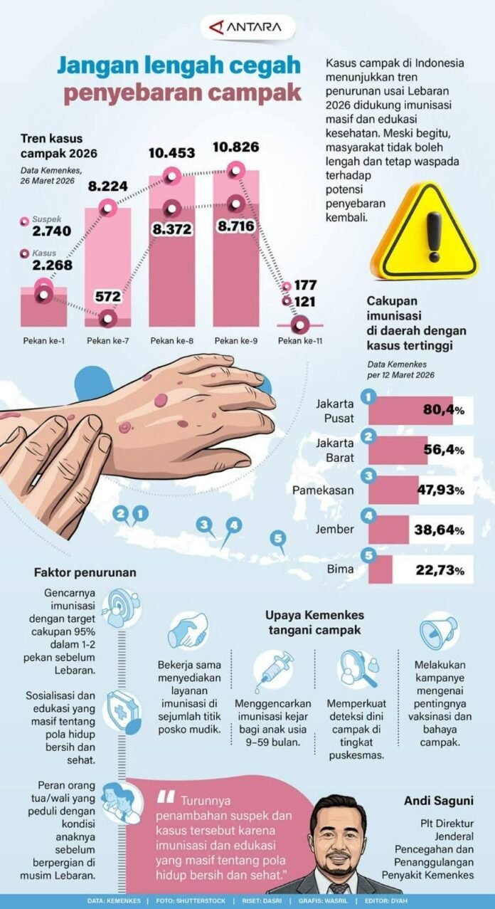 Orang tua diimbau memastikan anak mendapat imunisasi lengkap, tidak mudah percaya hoaks, dan segera memeriksakan anak jika muncul gejala demam disertai ruam.