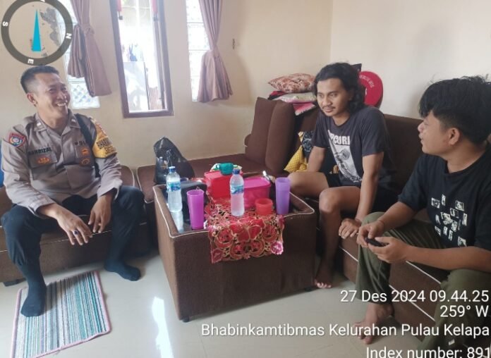 ACTUALNEWS.ID, Jakarta – Bhabinkamtibmas Pulau Kelapa, Polres Kepulauan Seribu, Aipda Sahrizal, melaksanakan kegiatan sambang ke warga masyarakat Pulau Kelapa pada Sabtu (28/12/2024). Dalam kegiatan tersebut, Aipda Sahrizal menyampaikan sejumlah pesan keamanan dan ketertiban masyarakat (kamtibmas) kepada warga, khususnya para pemilik homestay yang ada di wilayah tersebut.