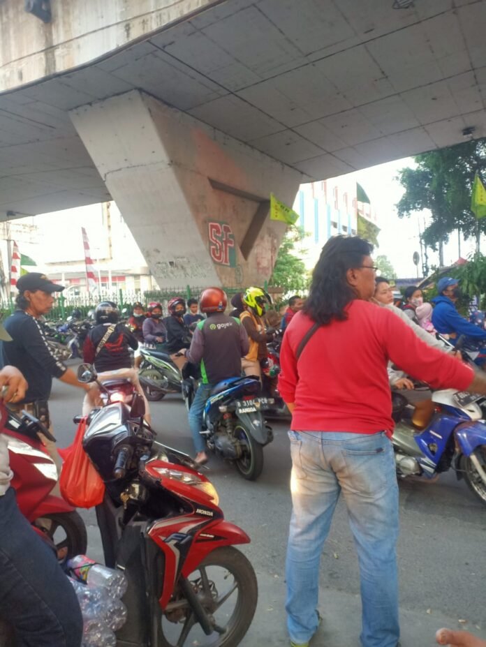 Menurut Bonang salah seorang anggota FBR yang membantu mengatur kemacetan lalulintas mengatakan, Kemacetan ini karena pas waktunya pekerja pulang sehabis bekerja, Jelasnya.