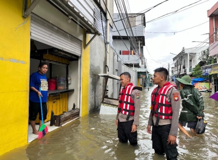 Tim kepolisian menggunakan perahu karet untuk membantu warga yang terjebak banjir. Selain itu, petugas juga memastikan keamanan di sekitar lokasi agar tidak terjadi tindak kejahatan selama situasi darurat ini.