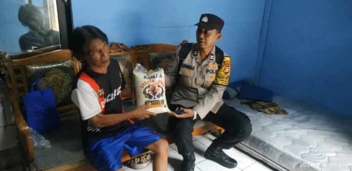 Aiptu Lukman memberikan bantuan sembako yang berisi beras 5 kg kepada warganya yang hanya bekerja serabutan, buruh cuci maupun harian.