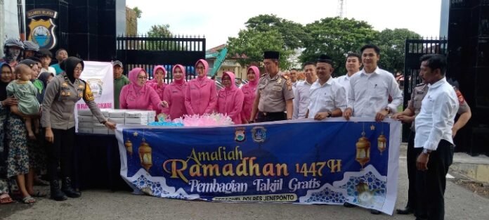 ACTUALNEWS.ID, Jenepinto -Dalam rangka menebar berkah di bulan suci Ramadhan, Satuan Narkoba Polres Jeneponto bersama ibu-ibu Bhayangkari melaksanakan kegiatan sosial dengan membagikan takjil gratis kepada masyarakat di Mapolres Jeneponto, Rabu (11/3/2026).