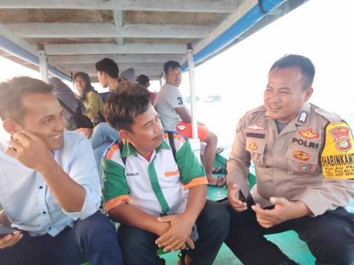 Dalam pertemuan yang hangat dan penuh keakraban, Bripka Marwansyah berdiskusi dengan kedua warga tersebut tentang kondisi keamanan di Pulau Pramuka dan cara-cara untuk menjaga ketertiban di lingkungan sekitar. Diskusi berlangsung santai di atas kapal kayu, diiringi dengan deburan ombak dan semilir angin laut yang menambah kehangatan suasana.
