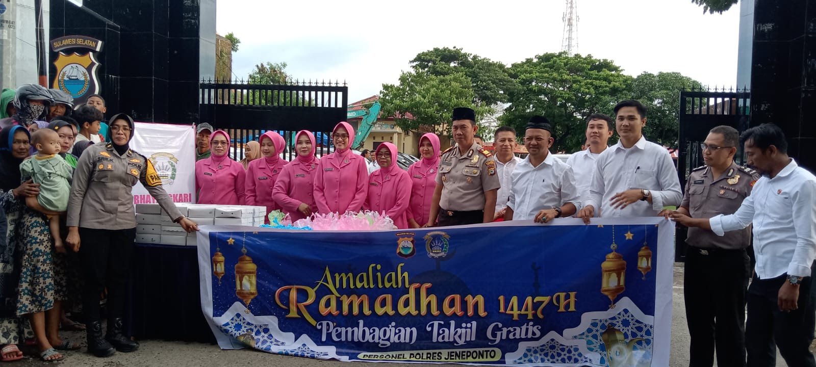 ACTUALNEWS.ID Jeneponto — Bhayangkari Peduli yang dipimpin istri Kapolres Jeneponto, Ibu Rati Haryo, bersama jajaran Bhayangkari menggelar kegiatan pembagian takjil gratis kepada masyarakat pengguna jalan di depan Polres Jeneponto, Senin (23/2/2026).