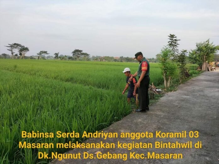 ACTUALNEWS.ID.Sragen – Mendampingi petani merupakan salah satu tugas Babinsa yang merupakan kegiatan upaya khusus (upsus), guna mendukung program Swasembada Pangan Nasional. Serda Suratno melaksanakan Giat Komsos dengan Bapak Dasno warga Dk. Gelangan, Desa Dawungan Kec. Masaran, Senin(05/06/2023 )