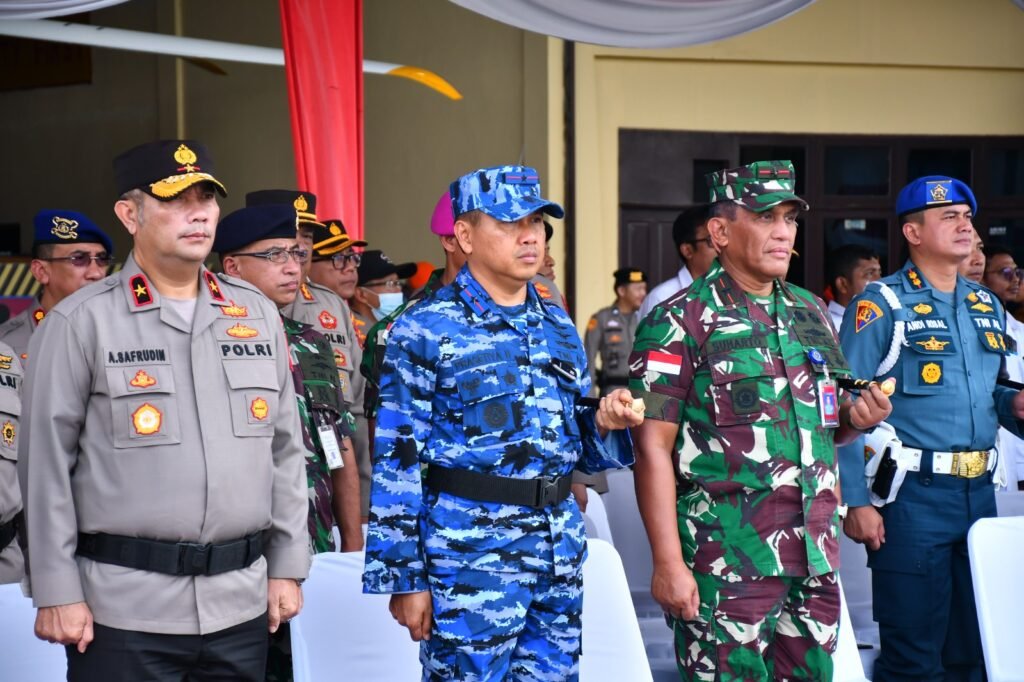 ACTUALNEWS.ID TNI AL, Lantamal XII,- Komandan Pangkalan Utama TNI Angkatan Laut (Danlantamal) XII beserta sejumlah personel Polisi Militer Angkatan Laut (Pomal) Lantamal XII menghadiri Apel Gelar Pasukan Operasi Kepolisian Terpusat “KETUPAT KAPUAS-2023” secara serentak di Lapangan Jananuraga Polda Kalbar, Jalan Jendral Ahmad Yani, Kelurahan Bangka Belitung, Kecamatan Pontianak Tenggara, Provinsi Kalimantan Barat, Senin (17/04/2023).