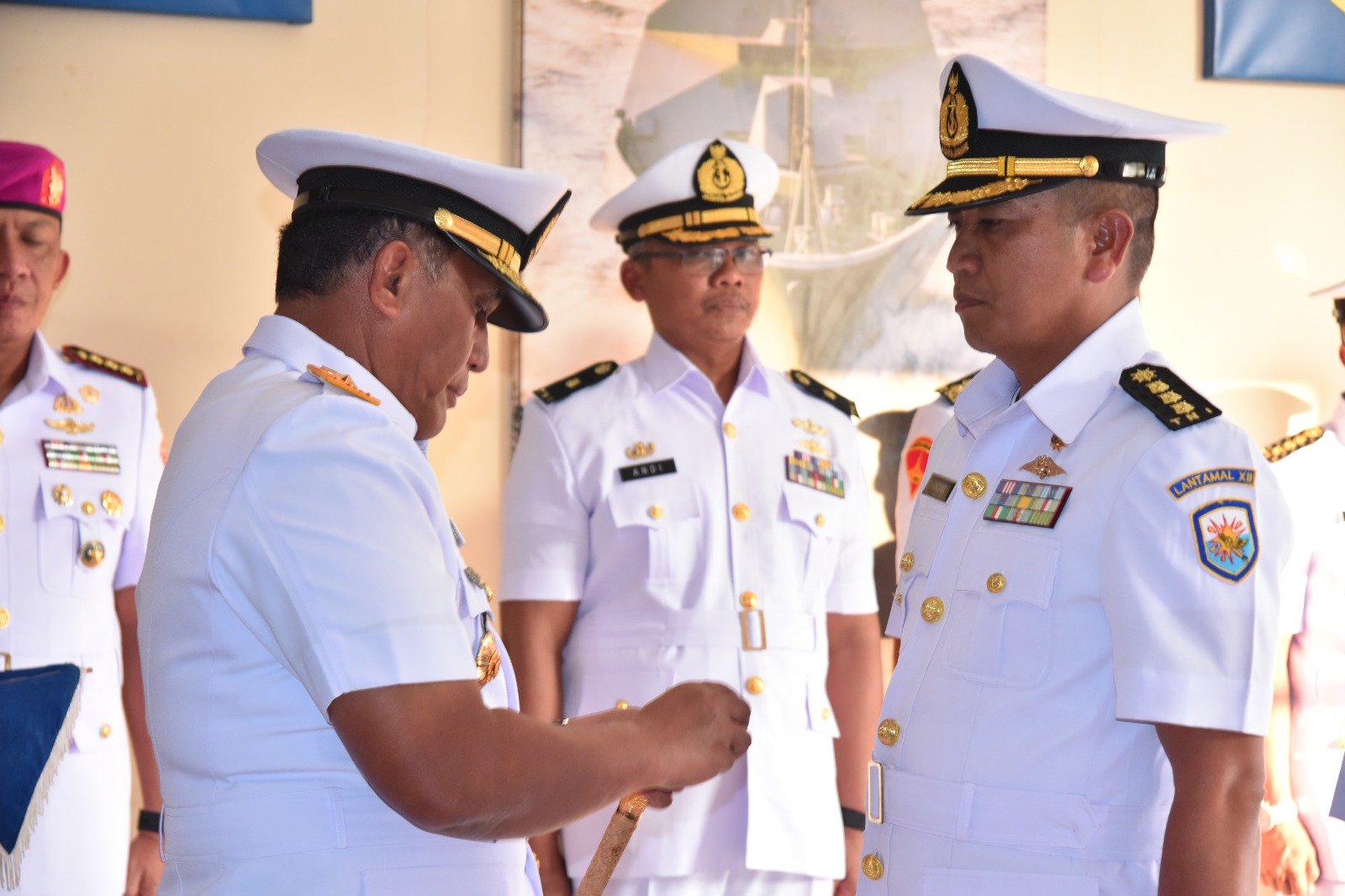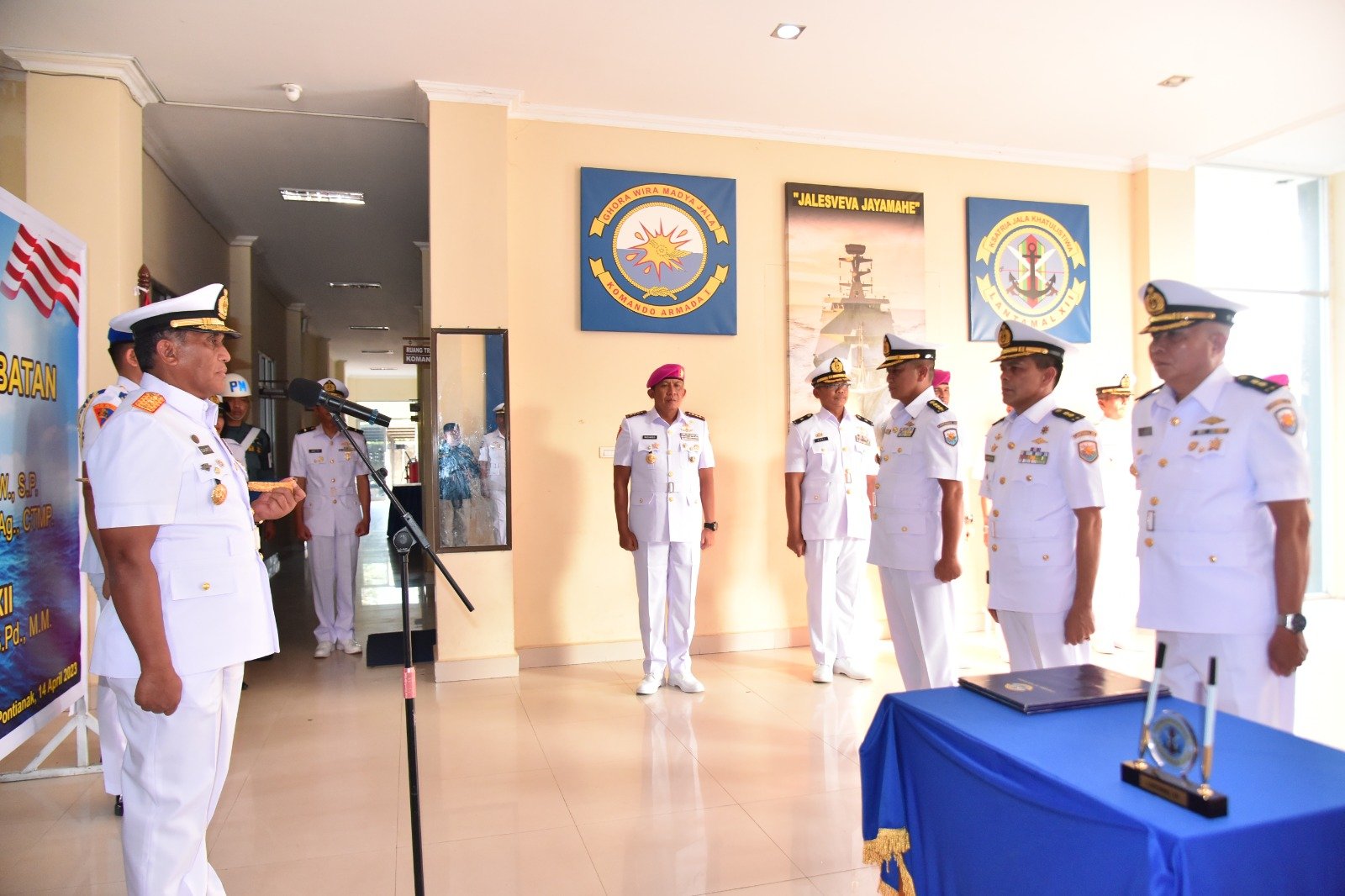 Acara Sertijab ini dilaksanakan berdasarkan Keputusan Kasal Nomor Kep/591/III/2023 dan Nomor Kep/697/III/2022 tentang Pemberhentian dari dan Pengangkatan dalam jabatan di lingkungan TNI AL Kolonel Laut (KH) Nur Legawa Handaka W, S.P., melepas jabatan Aspers Danlantamal XII diserahkan kepada Letkol Laut (KH) Muhibuddin, S.Ag., CTMP., dan Penyerahan Jabatan Kadispotmar Lantamal XII kepada Danlantamal XII dari Letkol Laut (KH) M. Arief B. Sulaiman E., S.Pd., M.M.