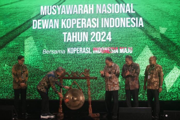 Menteri Koordinator Bidang Pangan Indonesia Zulkifli Hasan (Zulhas), didampingi Menteri Koperasi Budi Arie, Ketua Panitia Munas Dewan Koperasi Indonesia (Dekopin) Haris Rusly Moti (kanan), Ketum Dewan Koperasi Indonesia (Dekopin) Priskhianto dan Wakil Menteri Koperasi Ferry Joko Yuliantono, memukul Gong pada pembukaan Munas Dewan Koperasi Indonesia (Dekopin) di Jakarta, Jumat (27/12/2024). ACN/ja/RED