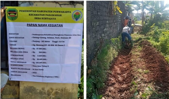 ACTUALNEWS.ID, Purwakarta – Pemerintah Desa Kertajaya, Kabupaten Purwakarta, merealisasikan anggaran Dana Desa (DD) Tahap II tahun 2025 pada proyek pembangunan Tebing Penahan Tanah (TPT) saluran di Dusun I.Senin,(08/2025.