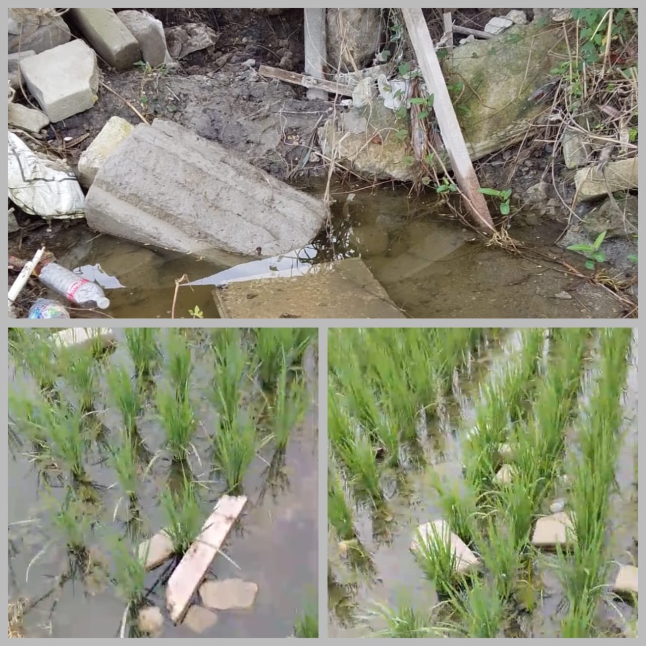 “Waduh, ini batu hebel berserakan di sawah, Pak. Sudah beberapa kali hanyut ke lahan saya. Air limbahnya juga mencemari padi hingga tanah sawah jadi mengeras karena tercampur semen. Kami mohon pertanggungjawabannya,” ujar KL dengan nada kesal.