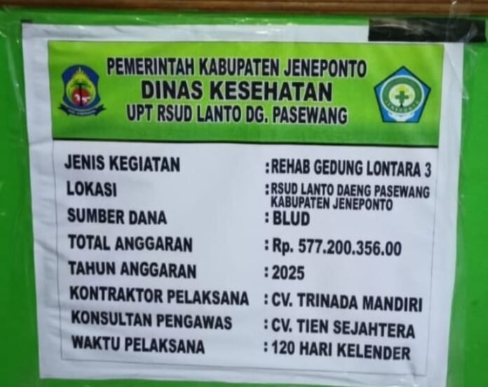 ACTUALNEWS ID Jeneponto, 3 November 2025 — Sejumlah proyek di Rumah Sakit Umum Daerah (RSUD) Lanto Daeng Pasewang (Latopas) Kabupaten Jeneponto yang bersumber dari dana BLUD diduga dikerjakan oleh satu orang yang menggunakan berbagai nama pelaksana. Kondisi ini menimbulkan tanda tanya besar terkait transparansi dan sistem pengawasan terhadap proyek-proyek tersebut.