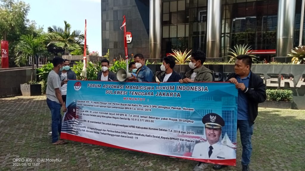 ACTUALNEWS.ID, Jakarta – Forum Advokasi Mahasiswa Hukum Indonesia (FAMHI) Sulawesi Tenggara (Sultra – Jakarta)  Mengultimatumkan beberapa Poin Tuntutan mendesak sekaligus meminta kepada  Komisi Pemberantasan Korupsi Republik Indonesia (KPK-RI) agar segera memanggil dan memeriksa Bupati Konawe Selatan dan Kadis PU & Tata ruang serta Lima OPD di Kabupaten Konawe Selatan,