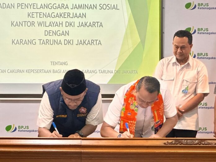 ACTUALNEWS.ID Jakarta – Senin 16 Juni 2025 – Jakarta, BPJS Ketenagakerjaan Wilayah DKI Jakarta yang dipimpin oleh Kepalanya Deny Yusyulian melakukan kerjasama kelembagaan dengan Karang Taruna Provinsi DKI Jakarta guna meningkatkan layanan perlindungan warga dan masyarakat khususnya di wilayah DKI Jakarta. Acara kerjasama kelembagaan ini dilakukan Senin,16 Juni 2025 berlangsung di Graha BPJS Ketenagakerjaan, Salemba Jakarta Pusat, pada sore hari. Penandatanganan MOU menjadi payung bagi implementasi kegiatan yang segera akan dilakukan bersama antara BPJS dan Karang Taruna DKI Jakarta yang memiliki akar sampai tingkat RW di Jakarta. Acara penandatanganan ini dilakukan oleh Deny Yusyulian bersama Akmal B.Y dari Karang Taruna, yang disaksikan oleh Staff Ahli Gubernur DKI Jakarta, Raihanda Rafi.