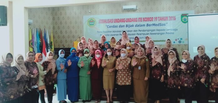 ACTUALNEWS.ID, Kamis 24 Juni 2022 Palembang Sumatera Selatan – BKOW SUMSEL mengadakan sosialisasi UU ITE nomor 19 tahun 2016. Dalam tema “Cerdas dan bijak dalam berMedsos” sosialisasi tersebut dihadiri dari berbagai ormas perempuan dan instansi terkait. Ibu Darma wanita Propinsi, Darma Pertiwi, IWAPI, IPEMI, Ikatan istri semen Baturaja dan lainnya, tak ketinggalan Srikandi Pemuda Pancasila ikut menghadiri acara tersebut.