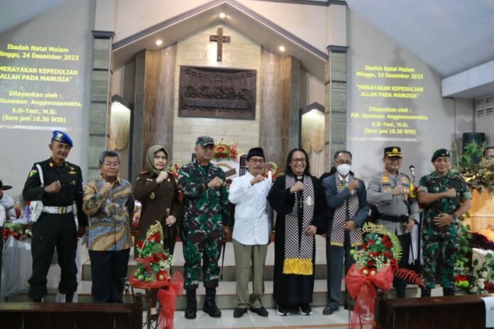 ACTUALNEWS.ID, Sragen – Natal adalah hari raya umat Kristen yang diperingati setiap tahun oleh umat Kristiani pada tanggal 25 Desember setiap tahunnya. Perayaan tersebut untuk memperingati hari kelahiran Yesus Kristus. Natal dirayakan dalam kebaktian malam pada tanggal 24 Desember dan kebaktian pagi tanggal 25 Desember. Dandim 0725/Sragen Letkol Inf Yoga Yastinanda, S.I.P bersama Wakil Bupati Sragen H.Suroto, Kapolres Sragen AKBP Jamal Alam, SH, SIK, M.Si, Kajari Sragen Virginia Hariztavianne, SH, MH, Wadanyon 408 Mayor Inf Hendri Kuswanto, Dansub Denpom Kapten Cpm Hadi dan Forkompimda lainnya sambangi gereja yang sedang melaksanakan misa. Minggu, 24/12/2023.