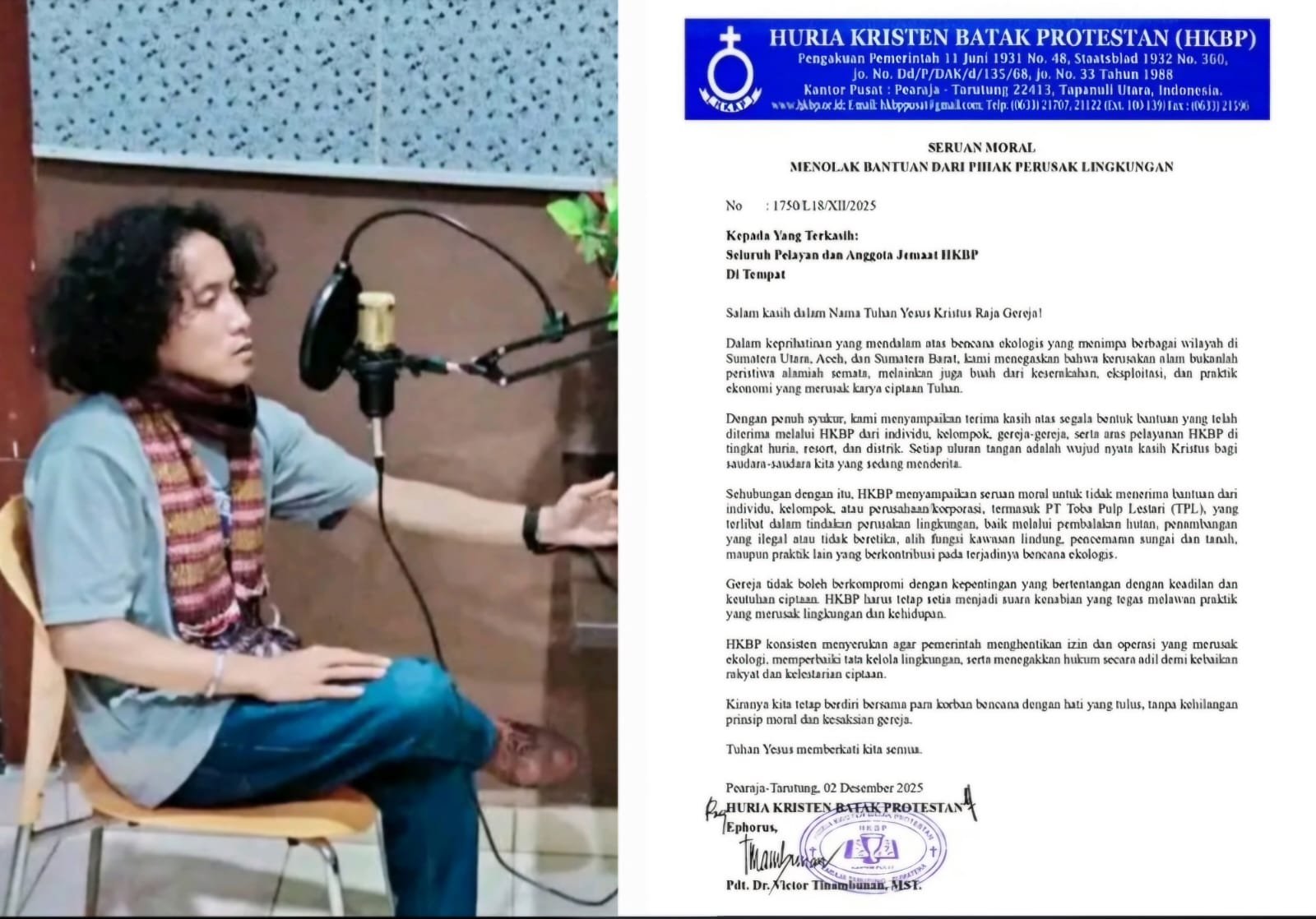ACTUALNEWS.ID Jakarta, 3 Desember 2025 — Di tengah duka mendalam akibat bencana Tanah longsor dan banjir bandang yang melanda Tapanuli serta sejumlah wilayah di Sumatera, jemaat HKBP dikejutkan oleh terbitnya Surat Edaran resmi bertajuk “Seruan Moral Menolak Bantuan dari Pihak Perusak Lingkungan” yang ditandatangani Ephorus HKBP, Pdt. Dr. Victor Tinambunan, pada 2 Desember 2025.