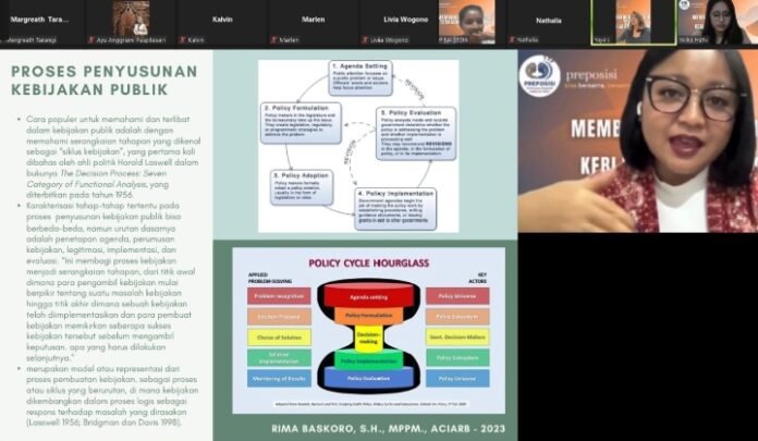 Acara diskusi daring Preposisi ini bertujuan untuk menumbuhkan kepedulian terhadap negara, meningkatkan kesadaran politik, dan membekali generasi muda dengan daya kritis terhadap kebijakan pemerintah. Narasumber dalam diskusi ini adalah Theofransus Litaay. S.H., L.LM., PhD dari Kedeputian V Kantor Staf Presiden RI dan Rima Baskoro, S.H., MPPM., ACIArb. selaku advokat dan peneliti kebijakan publik. Nathalia Mahuddin, S.E., ME., selaku ketua Preposisi menyampaikan bahwa kebijakan publik yang tepat sangat dibutuhkan dalam rangka menyongsong Indonesia Emas 2045. “Maka dibutuhkan kesadaran kritis semua elemen masyarakat terhadap jalannya proses implementasi sebuah kebijakan publik dan ketepatan kebijakan yang efektif dan efisien”, demikian ditambahkan Nathalia.