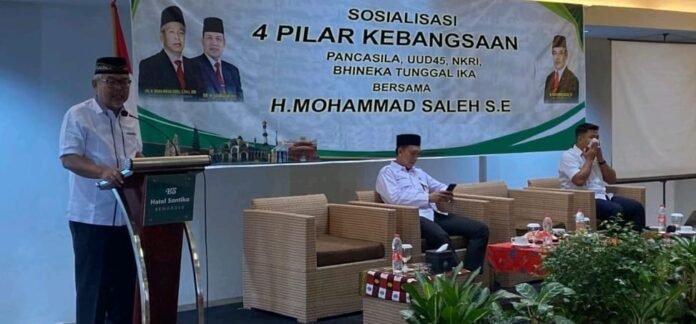 ACTUALNEWS.ID, Bengkulu – Anggota DPR RI/MPR RI asal Bengkulu, H. Mohammad Saleh SE, kembali menggelar sosialisasi 4 Pilar kebangsaan pada Rabu (31/7/2024). Berbeda dari biasanya, gelaran acara kali ini terlihat istimewa, karena diadakan di Hotel Mercure. Peserta yang diundang juga istimewa, karena semuanya adalah tokoh lintas agama yang tergabung dalam Forum Kerukunan Umat Beragama (FKUB). Panitia pelaksana acara ini juga istimewa, karena melibatkan Kementerian Agama Provinsi dan kota Bengkulu.