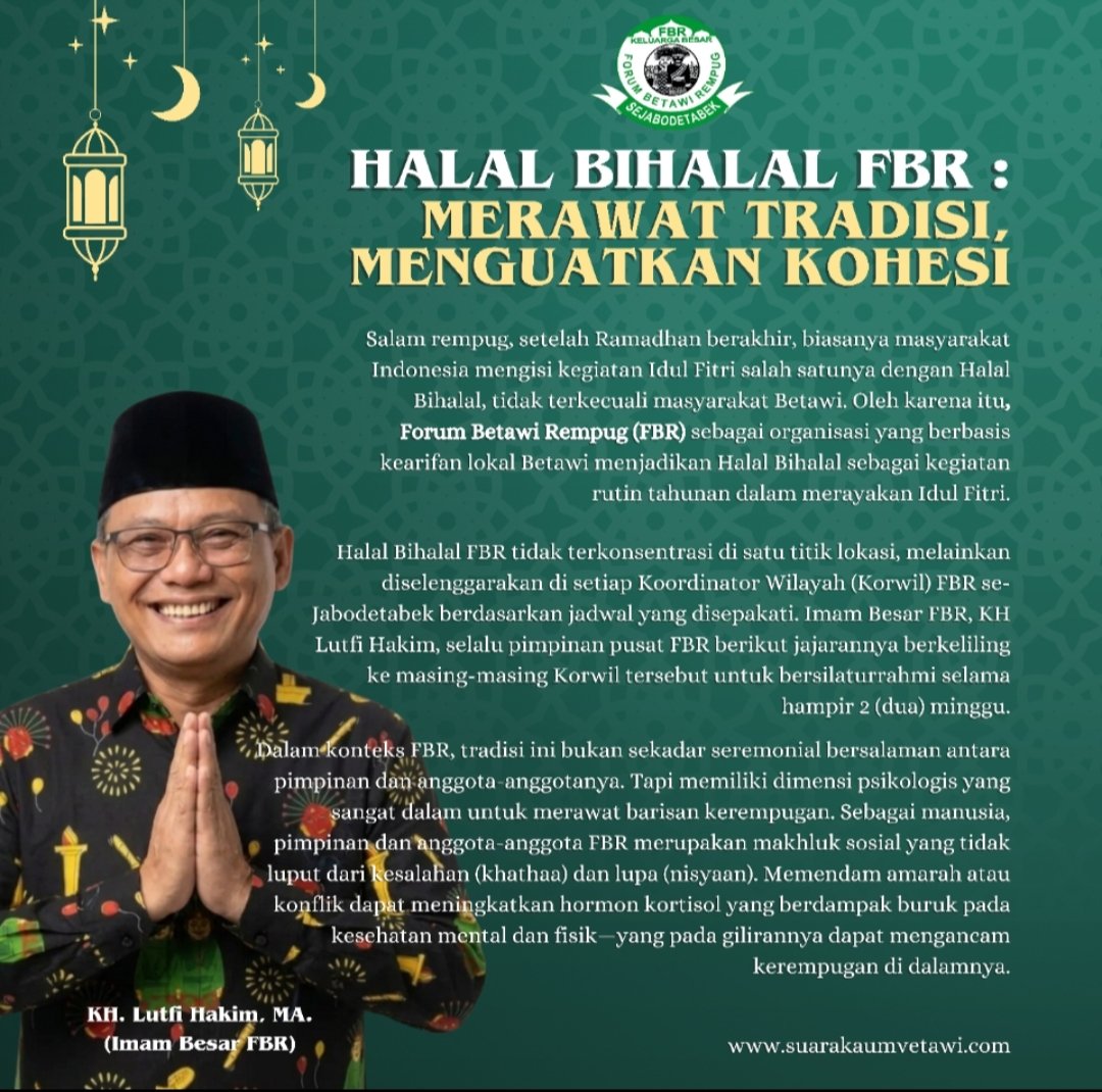 ACTUALNEWS.ID Jakarta,-Salam rempug, setelah Ramadhan berakhir, biasanya masyarakat Indonesia mengisi kegiatan Idul Fitri salah satunya dengan Halal Bihalal, tidak terkecuali masyarakat Betawi. Oleh karena itu, Forum Betawi Rempug (FBR) sebagai organisasi yang berbasis kearifan lokal Betawi menjadikan Halal Bihalal sebagai kegiatan rutin tahunan dalam merayakan Idul Fitri.