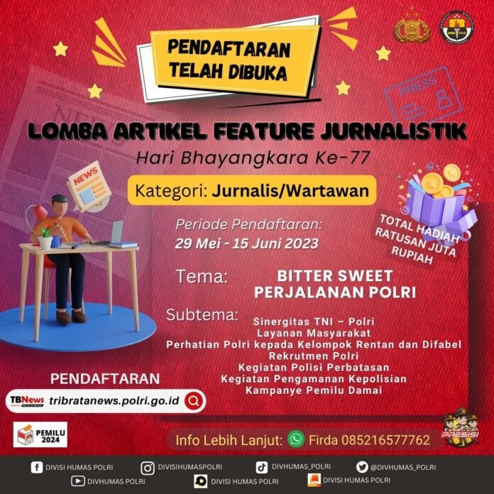 ACTUALNEWS.ID, Menjelang Hari Bhayangkara ke-77, Divisi Humas Polri mengadakan beberapa perlombaan seru nih Sobat Polri! Ayo daftarkan karyamu pada Lomba Menulis Artikel Jurnalistik dengan tema : “BITTER-SWEET PERJALANAN POLRI” .