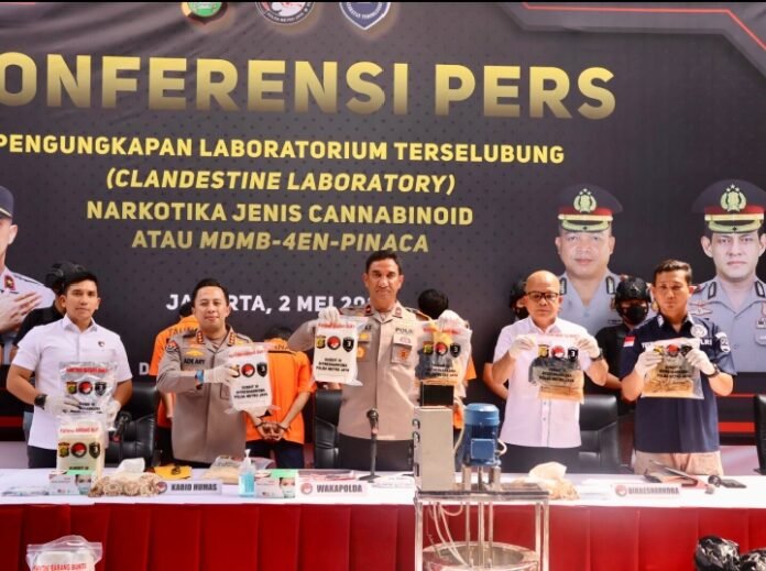 ACTUALNEWS.ID, Jakarta – Direktorat Reserse Narkoba Polda Metro Jaya mengungkap laboratorium terselubung atau clandestine laboratory narkotika jenis cannabinoid/MDMB-4en-Pinaca atau ganja sintetis di Cluster Mountain View, Jalan Gunung Pangrango Nomor 185, Sentul, Babakan Madang, Kabupaten Bogor. Dari pengungkapan ini, Polisi menangkap lima orang tersangka. Kamis (2/5/2024).