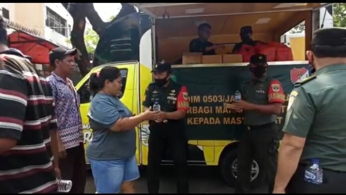 Penyaluran nasi kotak secara gratis dari Kodim 0503/JB di bagikan langsung kepada warga oleh jajaran anggota Koramil 02/TB bersama Mitra Jaya di Jl. Duri Selatan Raya Rt.005 Rw.02 Kel. Duri Selatan Kec.Tambora Jakarta barat.kamis (18/8).