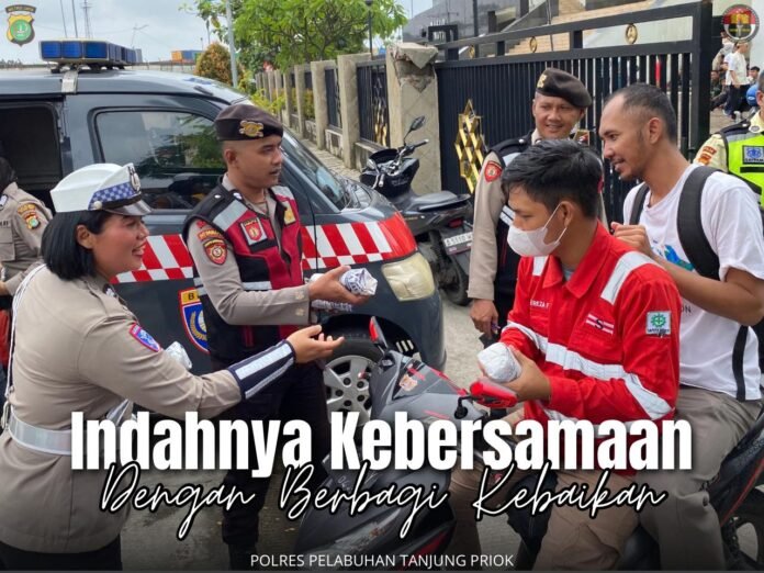 ACTUALNEWS.ID, Polres Pelabuhan Tanjung Priok kembali melaksanakan kegiatan Indahnya Kebersamaan Berbagi Kebaikan dengan membagikan 150 paket makanan siap santap kepada Jamaah Masjid Khodamutaqwa Pos 4 Pelabuhan Tanjung Priok dan sopir, kernet, petugas kebersihan, buruh Pelabuhan Tanjung Priok yang akan memasuki dan keluar Pos 1 Pelabuhan Tanjung Priok, pada hari Jumat tanggal 31Januari 2025.