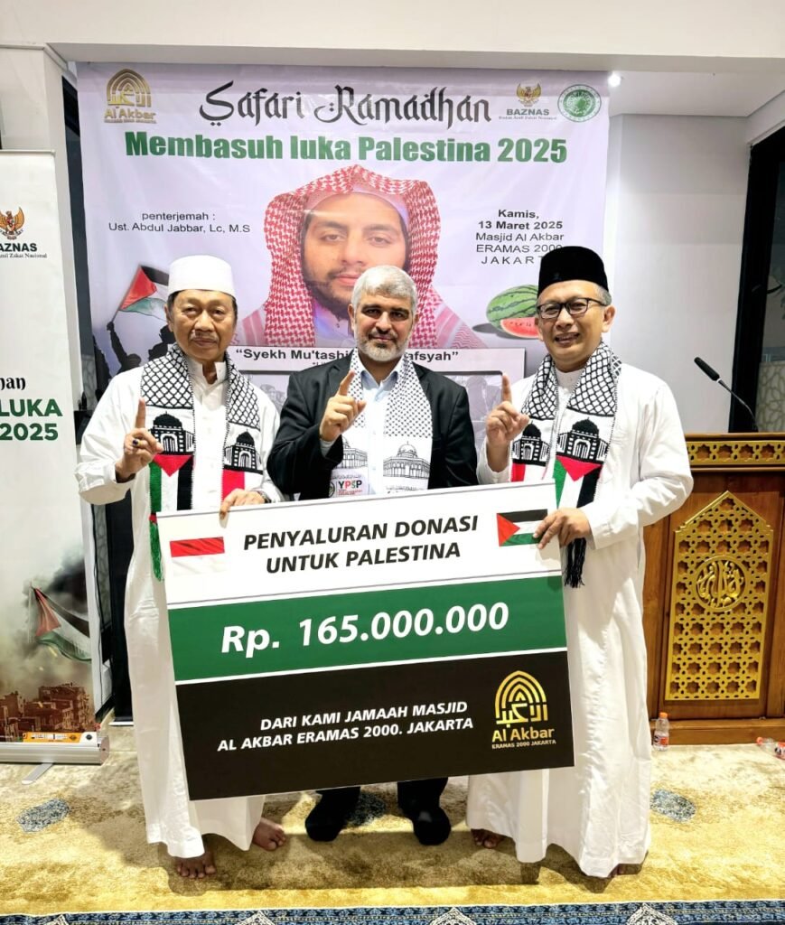 Acara ditutup dengan prosesi penyerahan donasi sebesar Rp 165 juta yang secara simbolis diserahkan oleh Ketua Dewan Syuro Masjid Al Akbar, H. Dadang Kadarsyah, kepada Syeikh Ahed Abulatta.