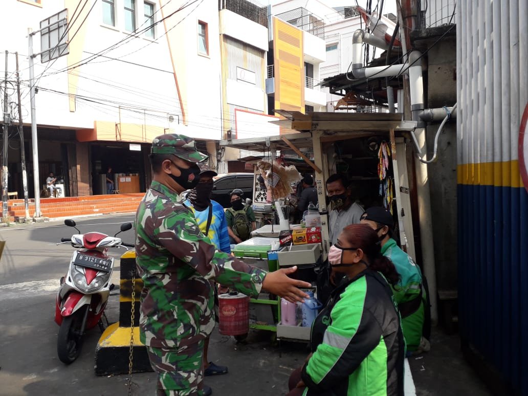 ACTUALNEWS.ID, Jakarta – Babinsa Koramil 01/TS Jakarta Barat sampaikan himbauan protokol kesehatan di kegiatan Komsos. yaitu, Serka Mukoddas Anggota Koramil 01/TS Kodim 0503/JB melaksanakan komsos bertempat di Kios Kaki Lima dan lokasi ojol nongkrong di Jalan Mangga besar II Kelurahan Tamansari Kecamatan Tamansari, Jakarta Barat.