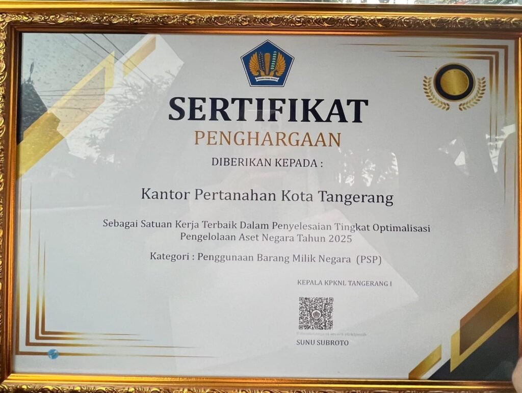 ACTUALNEWS.ID Tangerang – Kantor Pertanahan Kota Tangerang menerima penghargaan bergengsi dari KPKNL Tangerang I sebagai Satuan Kerja Terbaik dalam penyelesaian tingkat optimalisasi pengelolaan aset negara tahun 2025, khususnya dalam kategori penggunaan Barang Milik Negara.