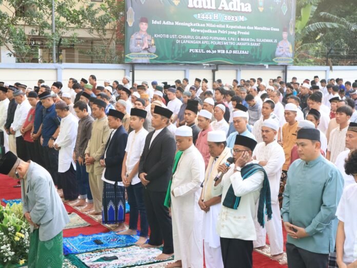 ACTUALNEWS.ID Jakarta Barat,– Memperingati hari raya Idul Adha yang ke 1444H, Kapolres Metro Jakarta Barat Kombes Pol M Syahduddi Berserta anggota Polres Metro Jakarta barat melaksanakan sholat Idul Adha berjama’ah bertempat di Halaman Mako Polres Metro Jakarta Barat Jalan Daan Mogot Raya, Kamis (29/06/2023).