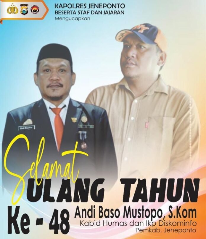 ACTUALNEWS.ID, Jeneponto – Dengan ini bapak Kapolres Jeneponto bersama jajarannya,beliau mengucapkan selamat ulang tahun kepada adinda kita, Andi Baso Mustopo,S.Kom yang ke 48, ujar katanya,, kepada awak media
