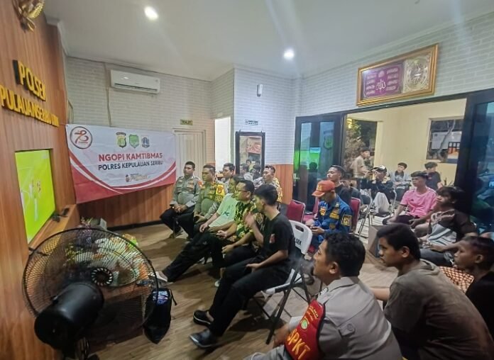 ACTUALNEWS.ID, Jakarta – Kapolsek Kepulauan Seribu Utara, Iptu Yoyo Hidayat, menggelar kegiatan Ngopi Kamtibmas sekaligus Nonton Bareng pertandingan sepak bola antara Indonesia melawan Bahrain di Kantor Polsek Kepulauan Seribu Utara, Kamis (10/10/2024). Kegiatan ini dihadiri oleh tokoh agama, tokoh masyarakat, dan para remaja dari Pulau Kelapa, dengan tujuan mempererat hubungan antara kepolisian dan masyarakat, serta menjaga keamanan dan ketertiban.