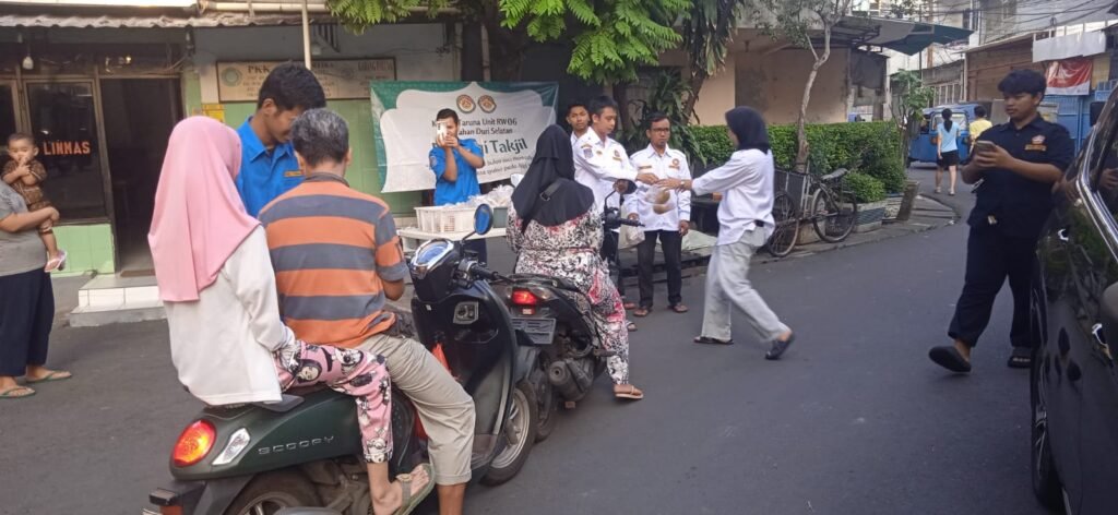 ACTUALNEWS.id, Jakarta Barat – Karang Taruna unit RW 06 Kelurahan Duri Selatan bersama Ketua RW 06 berbagi takjil didepan Kantor Sekretariat RW 06 Jalan Duri Selatan V RT 03/06 Kelurahan Duri Selatan Kecamatan Tambora Jakarta Barat, Minggu (23/3/2025).