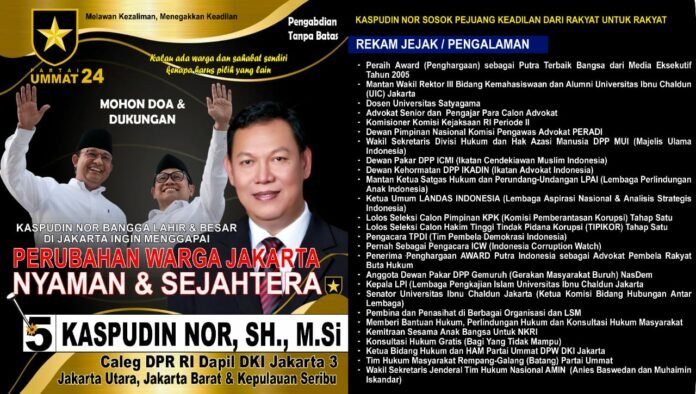 Hal inilah yang membuat Kaspudin Nor maju sebagai caleg DPR-RI dari Partai Ummat No. Urut 5 Daerah Pemilihan Jakarta Utara, Jakarta Barat, Kepulauan Seribu dengan maksud dapat melakukan perubahan terwujudnya kehidupan masyarakat yang adil dan sejahtera serta bermartabat sehingga di hargai oleh bangsa- bangsa di dunia..