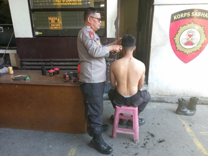 Bagi anggota Polri maupun masyarakat yang ingin potong rambut silahkan datang dilantai 2 ruang sat samapta polres Metro jakarta utara tidak dipungut biasa alias gratis ujar Sukamto.