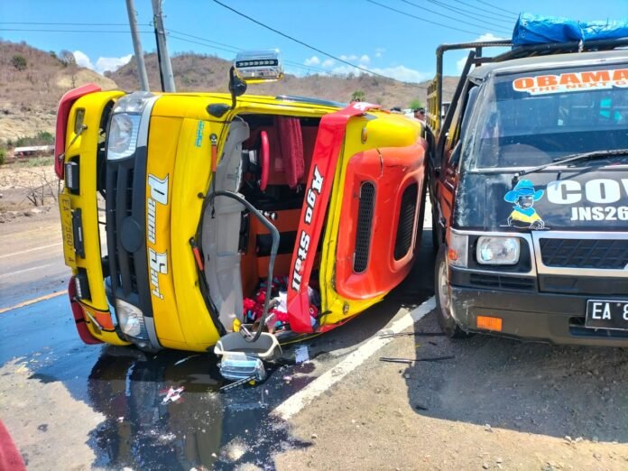 Kecelakaan antara Mobil Travel bertuliskan Panca Sari yang dikemudikan oleh AJ L/37 Warga Jalan Hasanuddin gang Teratai Bugis Kabupaten Sumbawa bernomor polisi 7560 A. dan Mobil Pickup yang dikemudikan Syafruddin L/50 Warga Desa Rato bernomor polisi EA 8138 XD Kecamatan Bolo Kabupaten Bima terjadi Rabu 28/09/22 Sekira Pukul 11.00.Wita.
