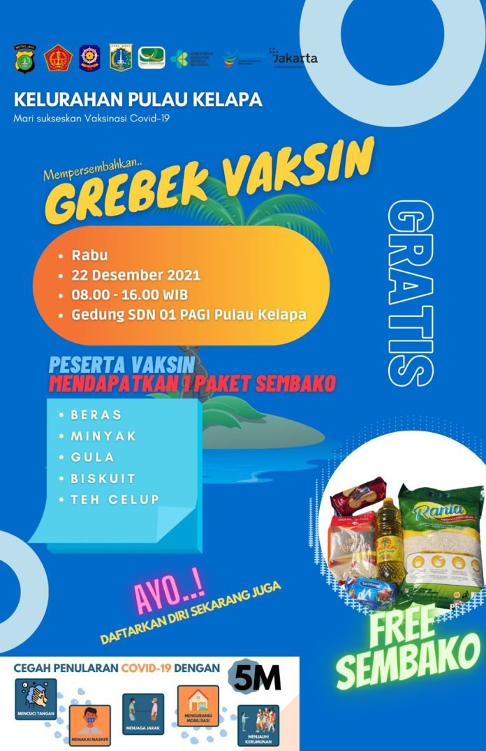 ACTUALNEWS.ID, Kepulauan Seribu – kelurahan pulau kelapa mengadakan grebek vaksin dosis 2 yang bertempat di gerai vaksin SDN 01 pagi pulau kelapa dan mendapatkan sembako ketika habis di vaksin. Spula,(21-12-2021).