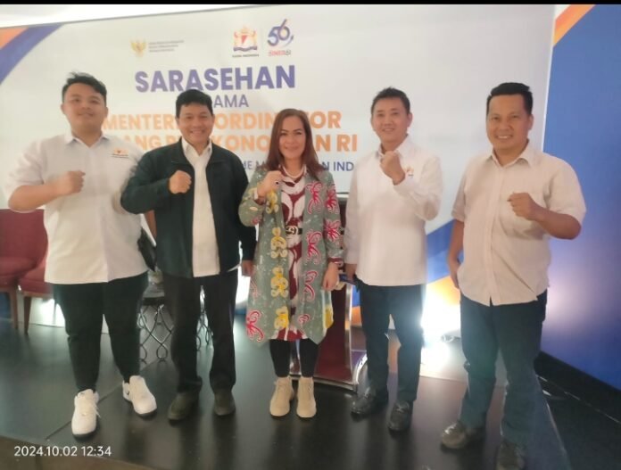 Sarasehan Ekonomi Bersama Menko Perekonomian turut dihadiri oleh Ketua Umum Asosiasi Pengusaha Perbatasan Indonesia (ASPPINDO), Novliana Turan dan Kabid Perbatasan Eddy Suryadi.