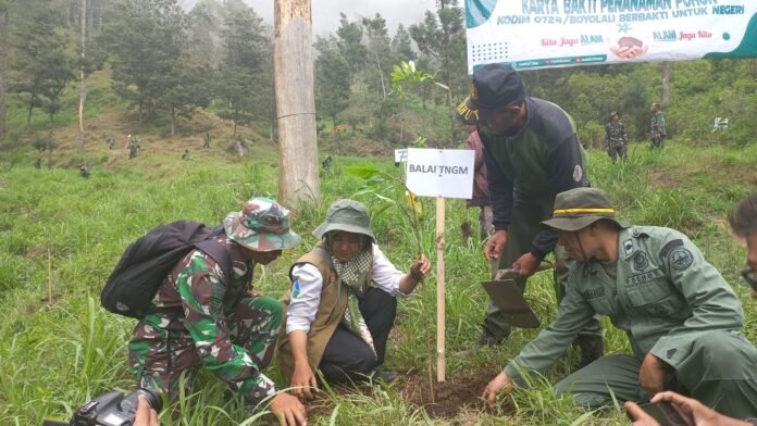 ACTUALNEWS.ID, Boyolali. Kodim 0724/Boyolali melakukan reboisasi ( Penghijauan ) di kawasan Taman Nasional lereng Gunung Merbabu sekitar Tuk Babon Dukuh Selowangan Desa Selo Kecamatan Selo Kabupaten Boyolali dengan menanam 500 bibit pohon, ( 8/12/23)