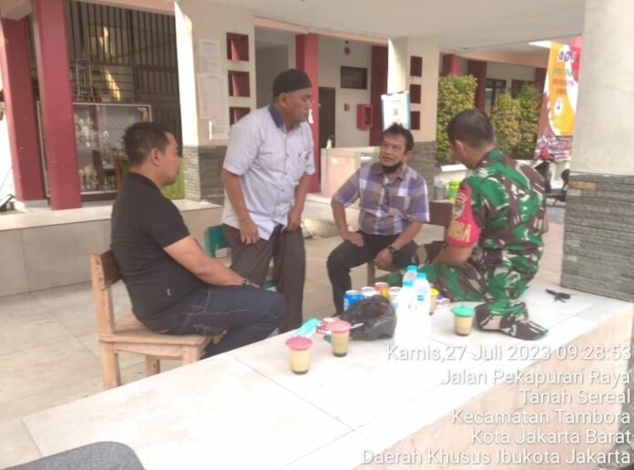 ACTUALNEWS.ID Kodam Jaya Jakarta – Anggota Koramil 02/TB Kodim 0503/JB Babinsa kelurahan Tanah Sereal Serka Nurhasan melaksanakan Komsos dan monitoring dengan Ketua RW 04 Muhroni , Bendara Komarudin dan Tokoh Masyarakat kelurahan tanah sereal Kecamatan Tambora Jakarta Barat.