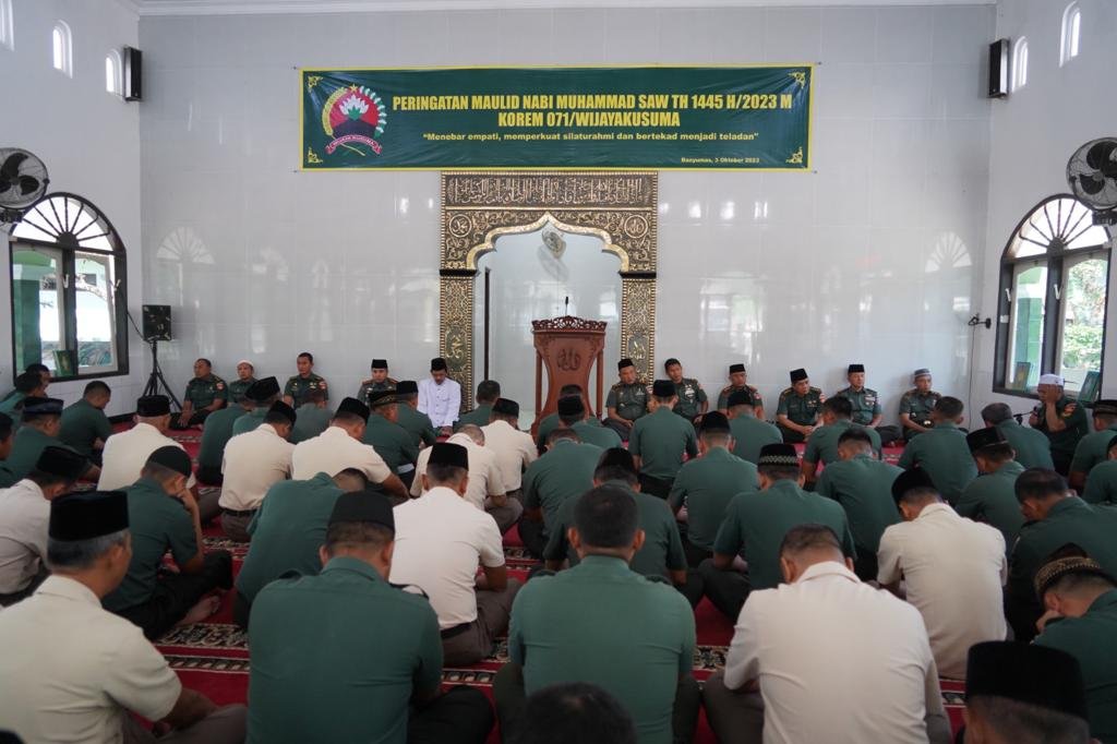 ACTUALNEWS.ID, Banyumas – Prajurit dan PNS Korem 071/Wijayakusuma mengikuti peringatan Maulid Nabi Besar Muhammad SAW 1445 H/2023 M di Masjid Wijayakusuma Makorem 071/Wijayakusuma Sokaraja, Banyumas, Selasa (3/10/2023).