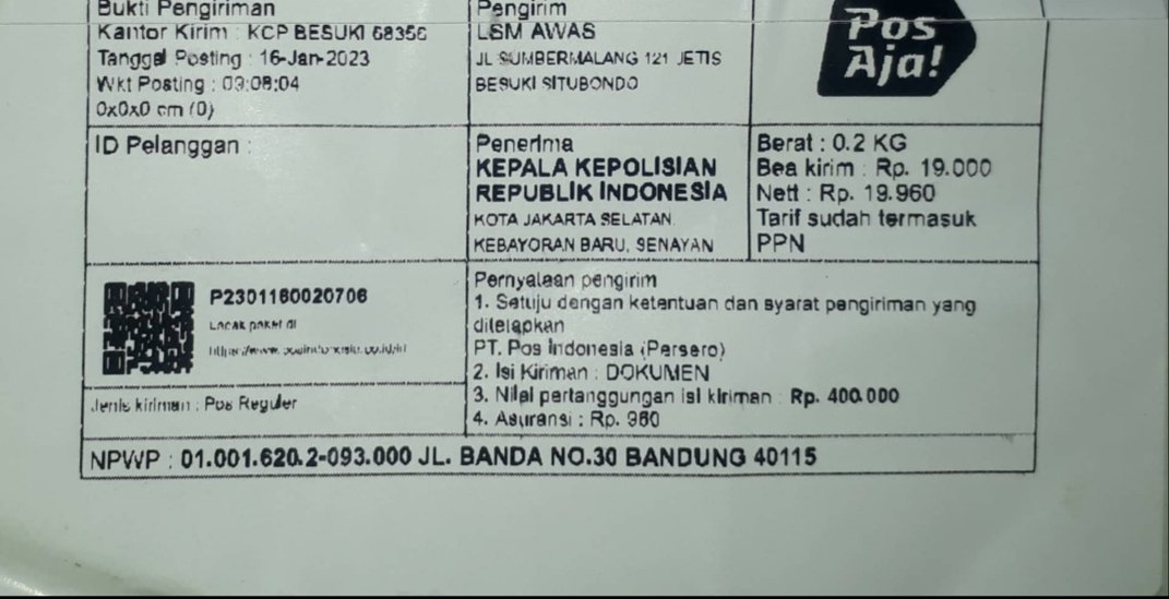 ACTUALNEWS.ID, SITUBONDO, – Lantaran diduga menerima perlakuan diskriminatif dari oknum SPKT Polres Situbondo, direktur LSM AWAS (Aliansi Wartawan Pengawas Situbondo) Rudi Bagas, terpaksa melayangkan surat pengaduannya melalui jasa pengiriman paket reguler milik PT Pos Indonesia ke Kapolri Jenderal Listyo Sigit Prabowo. Senin, (16/1/2023) kemarin.