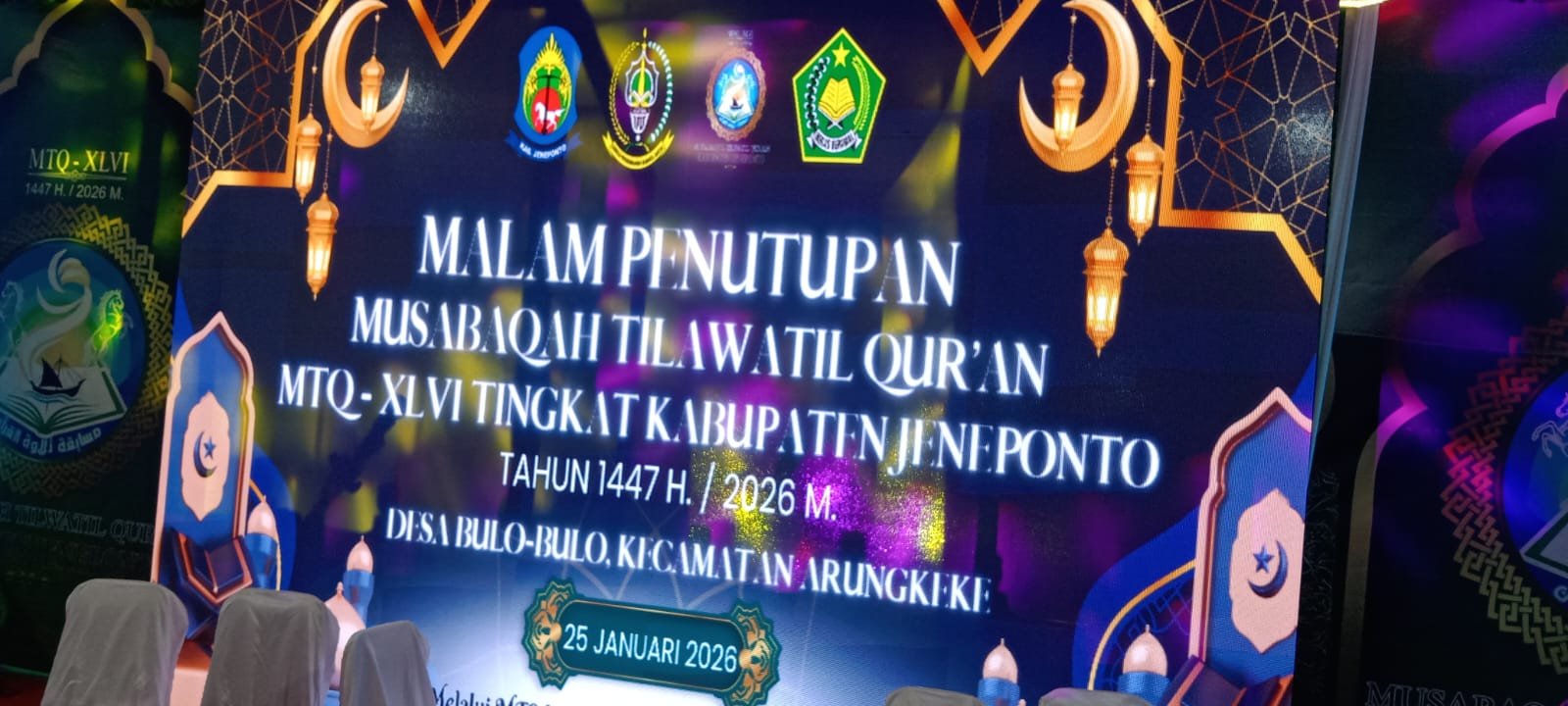 ACTUALNEWS.ID Jeneponto – Acara penutupan MTQ tingkat kecamatan se-kabupaten yang diselenggarakan pada hari Minggu, 25 Januari 2026, pukul 19:30 setelah salat Isya berjamaah.