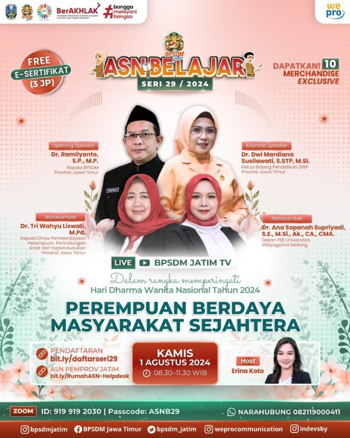 ACTUALNEWS.ID, Surabaya, Jawa Timur — Sebanyak 25.640 Aparatur Sipil Negara (ASN) dari seluruh Indonesia berpartisipasi dalam Webinar ASN Belajar Seri 29 yang diselenggarakan oleh Corporate University SDGs BPSDM Provinsi Jawa Timur pada Kamis, 1 Agustus 2024. Webinar ini mengusung tema “Perempuan Berdaya, Masyarakat Sejahtera,” yang bertujuan untuk menyoroti dan mengangkat peran penting perempuan dalam pembangunan bangsa.