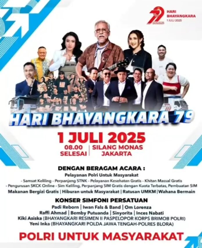 ACTUALNEWS.ID, Jakarta – Peringatan Hari Bhayangkara ke-79 yang jatuh pada 1 Juli 2025 berlangsung meriah di Kawasan Silang Monas, Jakarta. Ribuan masyarakat dari berbagai daerah antusias menghadiri acara yang digelar sejak pukul 08.00 WIB hingga selesai.