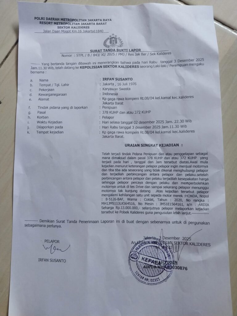 ACTUALNEWS.ID Jakarta | Modus penipuan dengan berpura-pura menjadi pembeli motor dan kemudian membawa kabur motor pemiliknya merupakan salah satu modus penipuan yang marak terjadi, terutama dalam transaksi cash on delivery (COD) atau jual beli melalui media sosial.