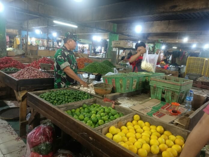 Dalam kegiatannya pada Jumat (8/9/2023) Serda Candra menemui para penjual di pasar tersebut sambil bersenda gurau dan penuh keakraban Ia menanyakan harga bahan pokok dan mendatanya,