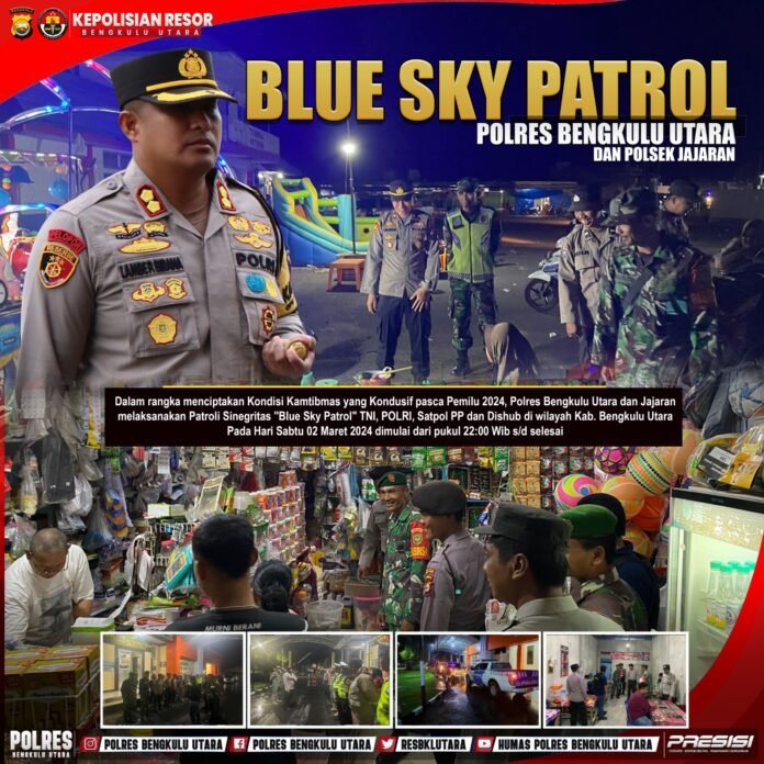 ACTUALNEWS.ID, Bengkulu – Dalam rangka menciptakan Kondisi Kamtibmas yang Kondusif Pasca Pemilu 2024, Polres Bengkulu Utara Rutin melaksanakan Kegiatan Patroli Sinegritas “Blue Sky Patrol” TNI, POLRI, Satpol PP dan Dishub, sekira pukul 22.00 WIB, pada Sabtu (02/03/2024).